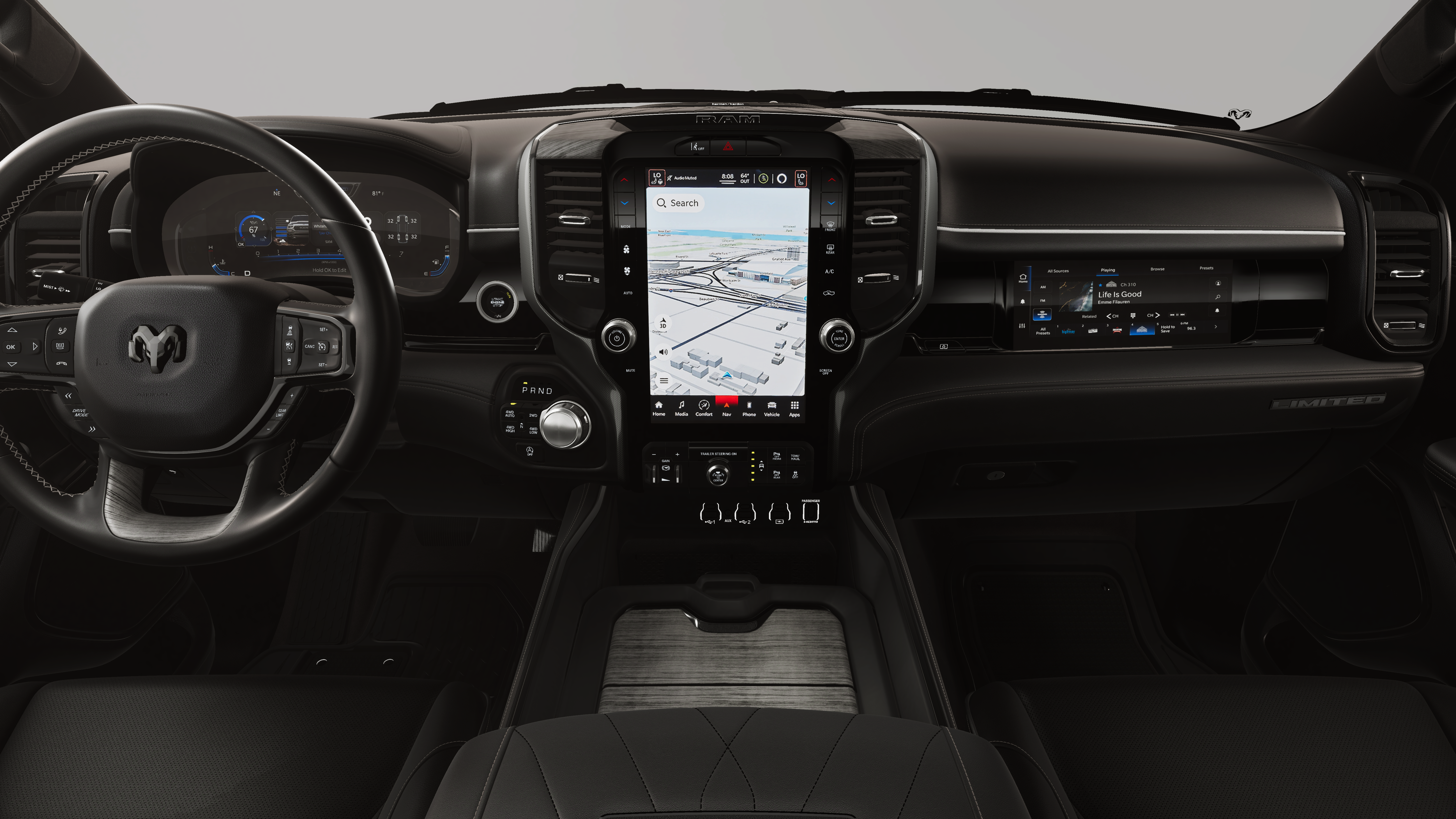 QUICK ORDER PACKAGE 27M LIMITED -inc: Engine: 5.7L V8 HEMI MDS VVT eTorque, Transmission: 8-Speed Automatic (8HP75) , TRAILER BRAKE CONTROL, TIRES: 285/45R22XL BSW ALL SEASON, NIGHT EDITION -inc: Tires: 285/45R22XL BSW All Season, Black Headlamp Bezels, Wheels: 22" x 9" Premium Black Aluminum, Pirelli Brand Tires, Accent Color Door Handles, Body Color Front Bumper, Body Color Rear Bumper w/Step Pads, RAM Grille Badge - Black, Black Painted Exterior Mirrors Caps, Accent Color Premium Power Mirrors, Sport Performance Hood, Black Exterior Truck Badging, Black Day Light Opening Moldings, Accent Color Tailgate Handle, Dual Exhaust w/Black Tips, Black Grille Surround Texture 7 Black, Black Tail Lamp Bezels, MYFLEXCARE SERVICE PLAN, IVORY WHITE TRI-COAT PEARLCOAT, ENGINE: 5.7L V8 HEMI MDS VVT ETORQUE -inc: 48V Belt Starter Generator, Heavy Duty Engine Cooling, Passive Tuned Mass Damper, Delete Alternator, G/T Exhaust, 18" Aluminum Spare Wheel, DUAL-PANE PANORAMIC SUNROOF -inc: LED Dome/Reading Lamp, Dome Dual LED Reading Lamp, BLACK, PREMIUM QUILTED LEATHER BUCKET SEATS, Wheels: 20" x 9" Premium Paint/Polished.